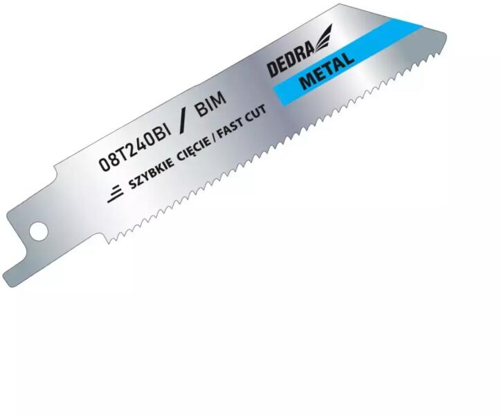 Magán a gépen és a munka stílusán kívül a fűrészlapok is meghatározzák a munka végeredményét. Egy rossz minőségű vagy rosszul megválasztott lap túlságosan megterhelheti a fűrészt. Ezenkívül a rossz minőségű acélból készült pengék nem könnyen kezelik a vágást, vagy legrosszabb esetben károsíthatják a munkadarabot. Ezért fontos, hogy a rókapengék jó minőségűek és alkalmasak legyenek az adott anyag vágására. A DEDRA felismerve a legjobb fűrészlapok iránti igényt, új fűrészlapokat vezetett be olyan anyagok vágásához, amelyek minden profi vagy barkácsoló otthon vagy a műhelyben megtalálhatóak. A DEDRA 08T240BI szablyafűrészlap fémvágáshoz. Fémek, vastag fémlemezek (3-8 mm) vágására tervezték. A fűrészlap maximális hossza 100 mm, a munkahossza pedig 75 mm. BiMetal acélból készült.